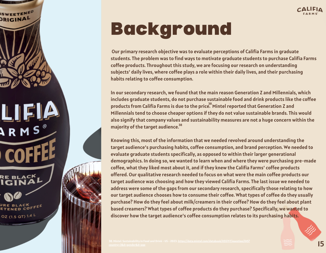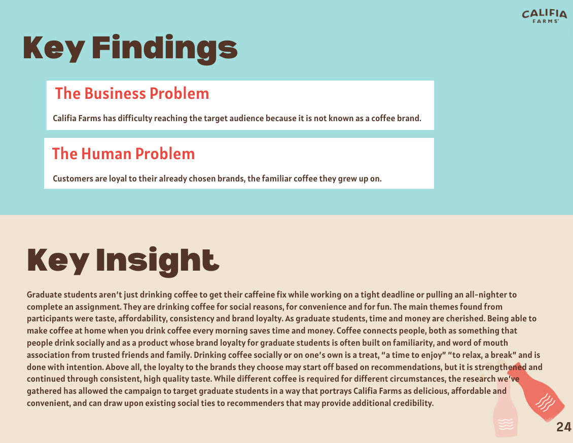 In one of my classes during my Master’s education, I collaborated with a group to create a plansbook for Califia Farms coffee products targeted at graduate students. Throughout this process, we conducted primary and secondary research and developed tactics to appeal to this audience. Individually, I contributed to each part of the plansbook and ultimately designed and edited it.